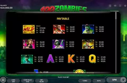 100 Zombies is a 5 rouleaux / 100 lignes slot game, released by Endorphina in in Octobre 2020