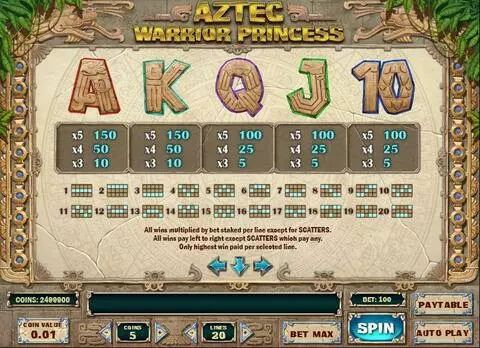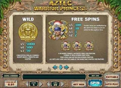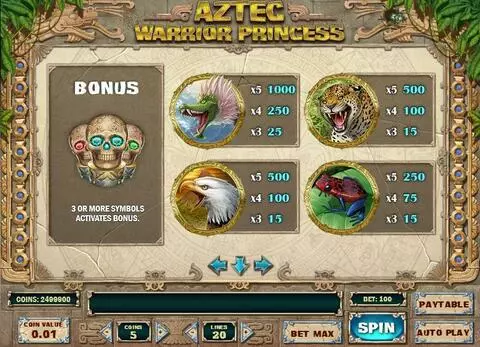 Aztec Warrior Princess is a 5 rouleaux / 20 lignes slot game, released by Play'n GO in in Mai 2017