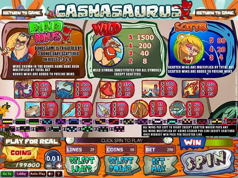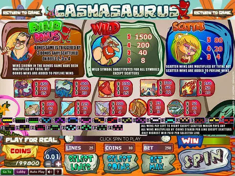 Cashasaurus is a 5 rouleaux / 25 lignes slot game, released by Wizard Gaming in n/a n/a