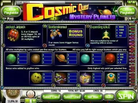 Cosmic Quest Episode Two is a 5 rouleaux / 20 lignes slot game, released by Rival in in Février 2009