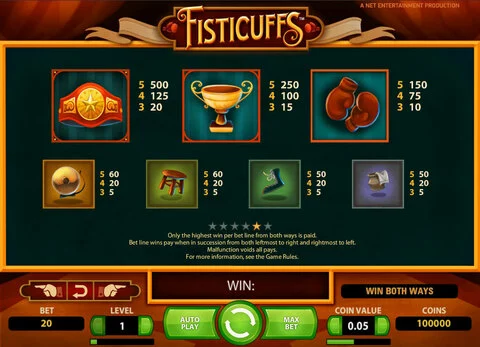 Fisticuffs is a 5 rouleaux / 10 lignes slot game, released by NetEnt in n/a n/a