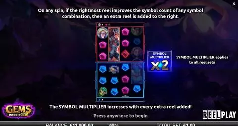 Gems Infinity Reels is a 4 rouleaux / Infinity slot game, released by ReelPlay in in Octobre 2021