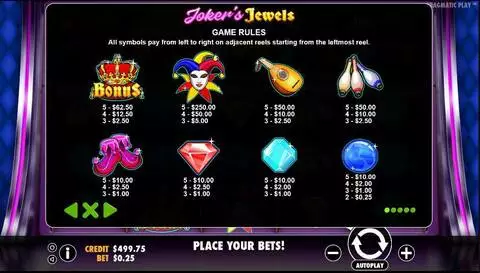 Joker's Jewels is a 5 rouleaux / 5 lignes slot game, released by Pragmatic Play in in Mars 2018