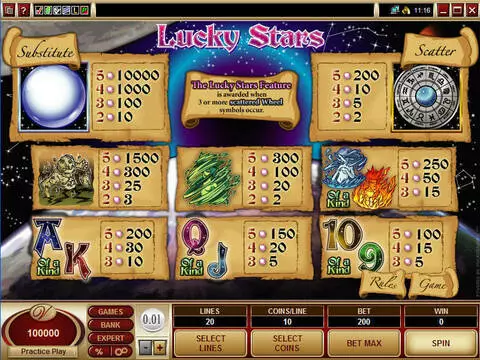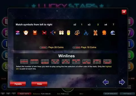 Lucky Stars is a 3 rouleaux / 5 lignes slot game, released by Slotland Software in n/a n/a