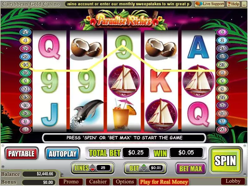 Paradise Riches is a 5 rouleaux / 25 lignes slot game, released by WGS Technology in in Août 2005