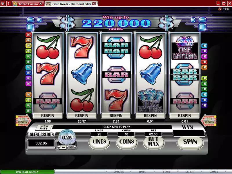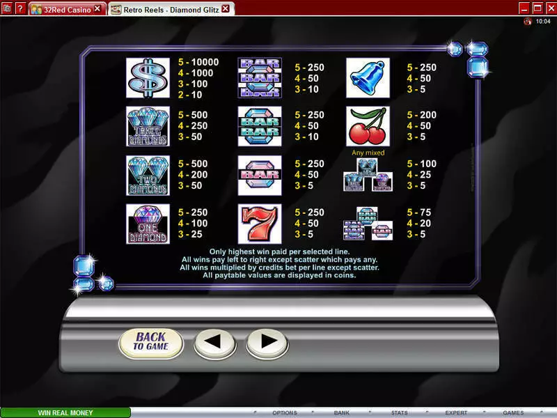 Retro Reels - Diamond Glitz is a 5 rouleaux / 25 lignes slot game, released by Microgaming in n/a n/a