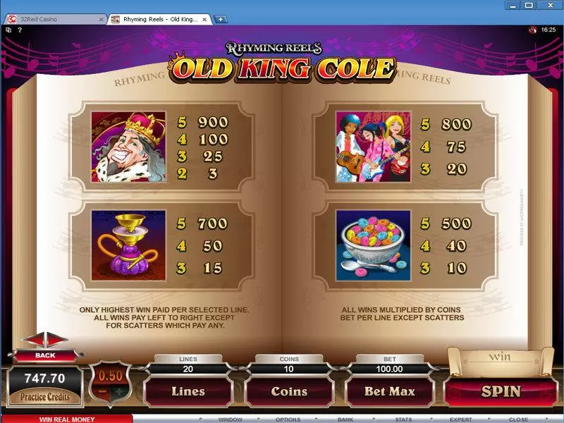 Rhyming Reels - Old King Cole is a 5 rouleaux / 20 lignes slot game, released by Microgaming in n/a n/a