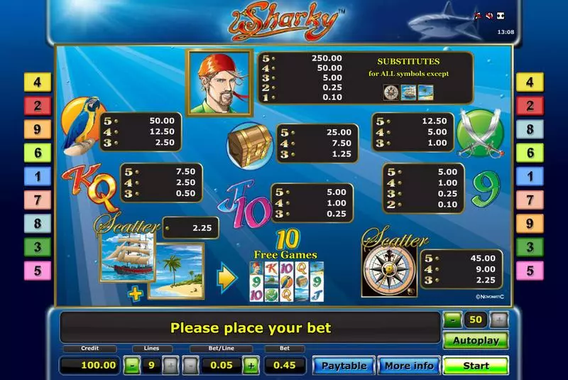 Sharky is a 5 rouleaux / 9 lignes slot game, released by Novomatic in n/a n/a