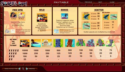Surf's Up is a 5 rouleaux / 15 lignes slot game, released by Amaya in n/a n/a