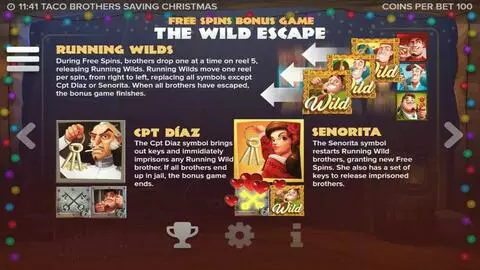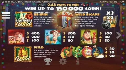 Taco Brothers Saving Christams is a 5 rouleaux / 248 lignes slot game, released by Elk Studios in in Novembre 2016