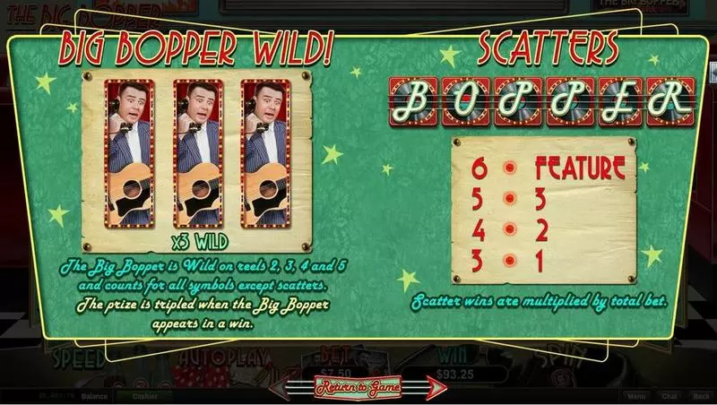 The Big Bopper is a 6 rouleaux / 729 lignes slot game, released by RTG in in Avril 2016