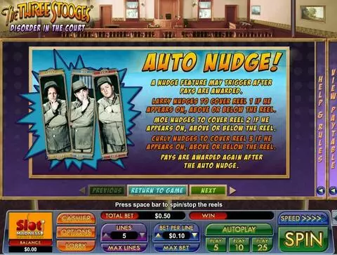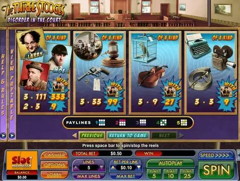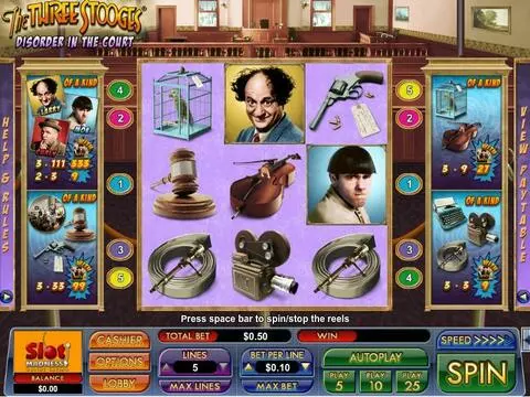 The Three Stooges Disorder in the Court is a 3 rouleaux / 5 lignes slot game, released by NuWorks in n/a n/a