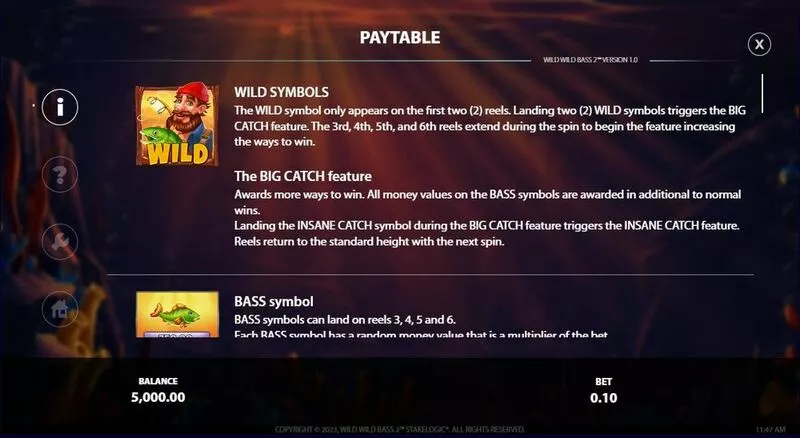 Wild Wild Bass 2 is a 5 rouleaux / 5625 Line 2304 lignes slot game, released by StakeLogic in in Septembre 2023